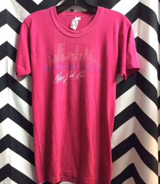 T-shirt, Manhattan, New York City, screen printed lettering & city skyline graphic, dark pink, size S