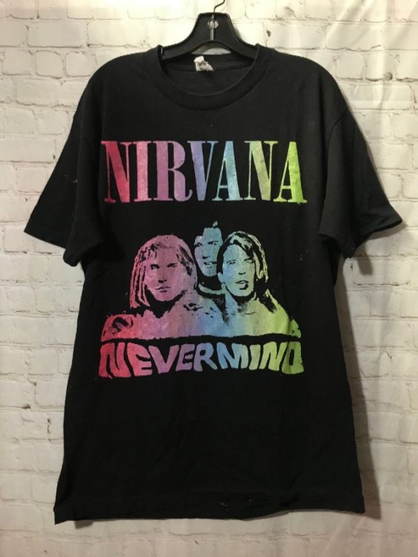 Alstyle T-shirt, Nirvana – Nevermind, screen printed ombré graphic design full front & full back, black/multi, size L. As is