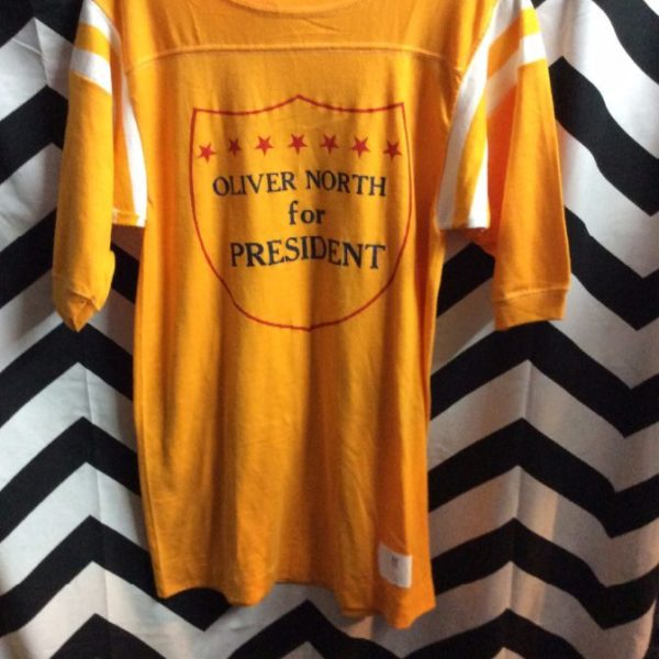 RETRO T-SHIRT – RINGER TEE – OLIVER NORTH FOR PRESIDENT – STRIPED DESIGN ON SHOULDERS