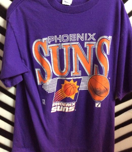 Classic Phoenix Suns T-shirt, screen printed full front design, purple/orange, size L