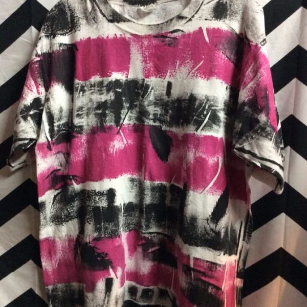 T-shirt, abstract artistic horizontal striped pattern, white/pink/black, size L