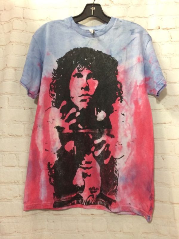 T-SHIRT, COTTON, TIE-DYED, JIM MORRISON, MIRRORED PORTRAIT DESIGN, SCREEN PRINTED CUSTOM GRAPHIC FRONT & BACK DESIGNS BY LOCAL ARTIST, PURPLE/RED/BLACK, SIZE M