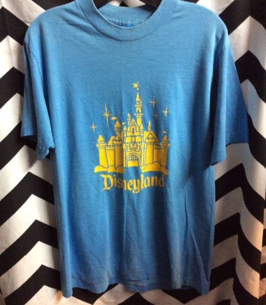 Retro Disney T-shirt, Disneyland Castle graphic, baby blue, yellow, size L