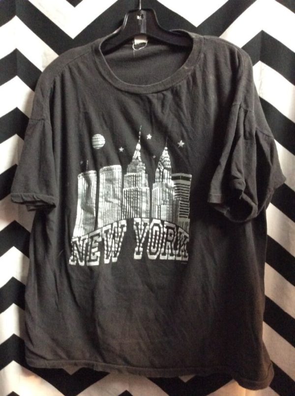 1990’s T-shirt, boxy tee, New York Skyline graphic with moon & stars, black/silver, size XXL
