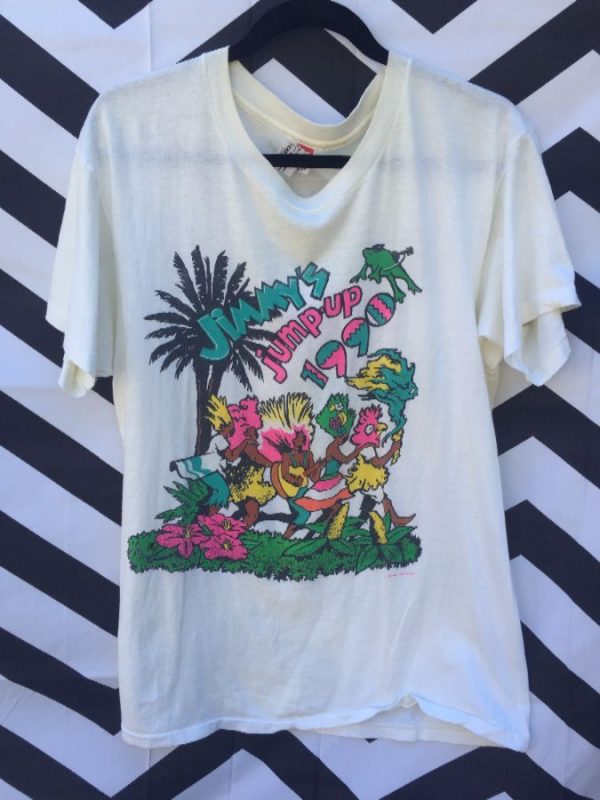 T-SHIRT, JIMMY BUFFETT, JIMMY’S JUMP-UP 1990, NEON COLORED GRAPHIC, SOFTY