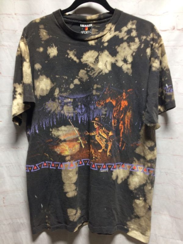 T-SHIRT TIE-DYED W/ COWBOY/HORSE/CAMPFIRE & SPIRIT WOLVES IN NIGHT SKY