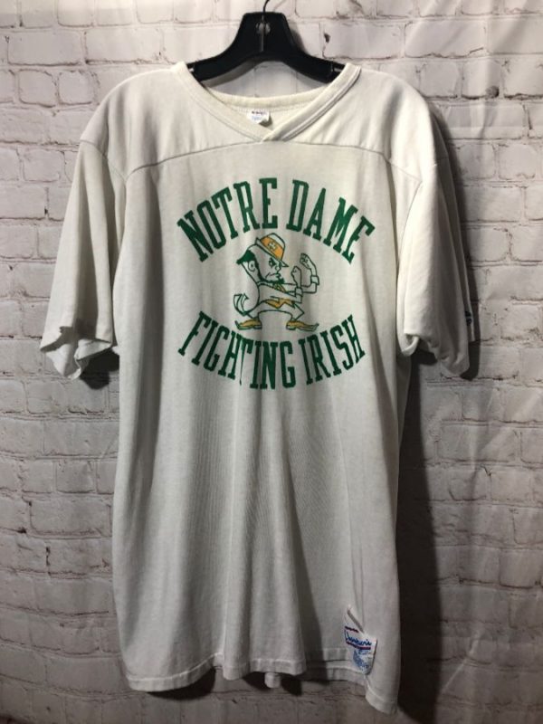 Champion T-shirt, sports jersey style, Norte Dame – Fighting Irish, screen printed graphic & lettering, white/green/yellow, size L