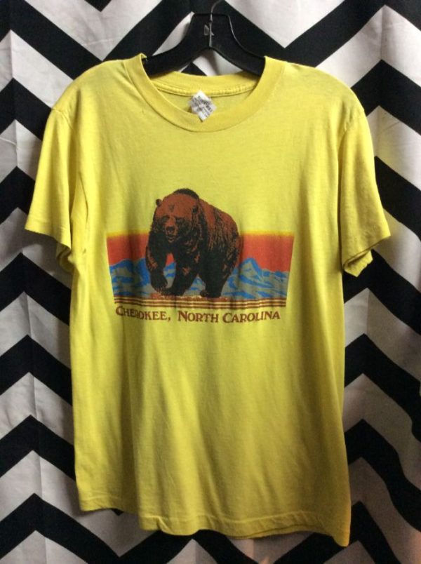 T-shirt, thin, soft, Cherokee, North Carolina, screen printed bear & mountain graphic design, yellow/multi, size L