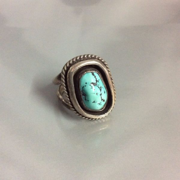 RING – TURQUOISE NUGGET – STERLING SILVER DOUBLE BAND SETTING – SIGNED JSD