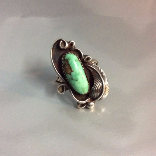 RING – TURQUOISE STONE – SILVER LEAF SETTING – SIGNED