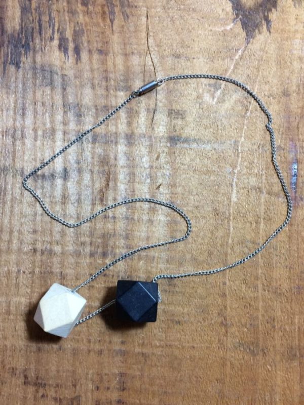 MktPrice necklace, wooden, (2) 14 sided geometric dice, silver metal link chain with magnetic closure, black/off white/silver, size N/A