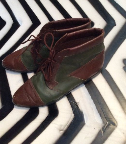 Ankle high leather shoes, lace-up, two-tone olive/brown