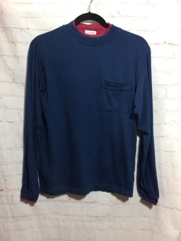 TWO TONED COTTON POCKET TEE T-SHIRT W/ LAYERED MOCK TURTLENECK