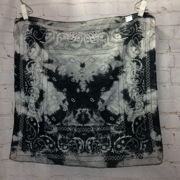 Bandana, polyester, square shape, tie-dyed, pattern of tiny center Paisleys surrounded by large Paisley designs, black/white