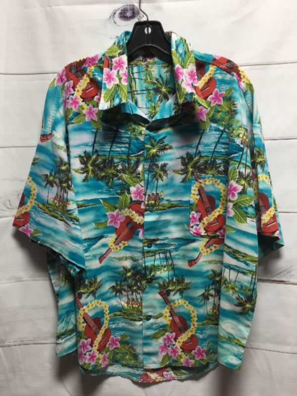 Hawaiian shirt, short sleeves, button-up, ukulele & flower leis print, turquoise/pink/green/brown/white, size XL