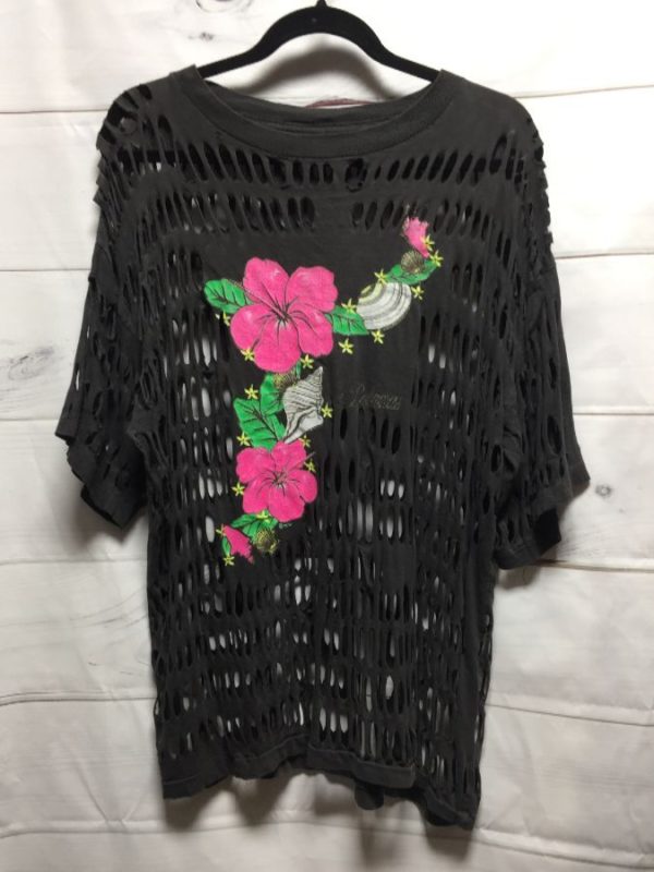 1980’S REPURPOSED T-SHIRT, ALLOVER VERTICAL SLITS, BAHAMAS, FLOWER & SEASHELL PRINT, SCREEN PRINTED FRONT DESIGN, UNIQUE, BLACK/PINK/GREEN/OFF-WHITE, SIZE L