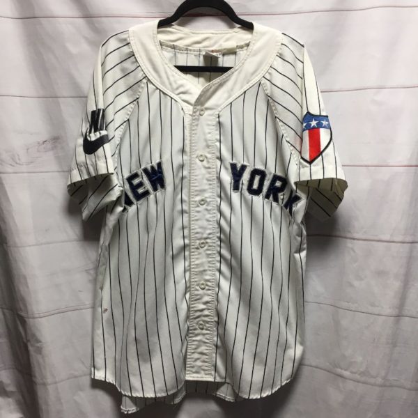 UNIQUE NIKE BASEBALL JERSEY, COTTON, SHORT SLEEVE, BUTTON-UP, V-NECK, PINSTRIPES, NEW YORK YANKEES, #23, MULTIPLE EMBROIDERED APPLIQUED PATCHES, WHITE/NAVY BLUE, SIZE XL#23