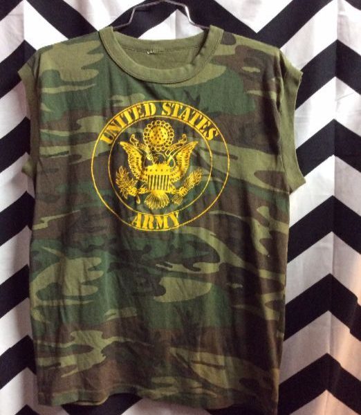 United States Army T-shirt, short sleeve, camo print fabric, screen printed design, camo green