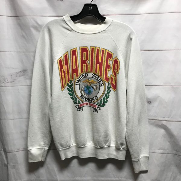SWEATSHIRT, PULLOVER, CREW-NECK, UNITED STATES MARINES, SEMPER FIDELIS, SCREEN PRINTED FRONT DESIGN, WHITE/RED, SIZE M