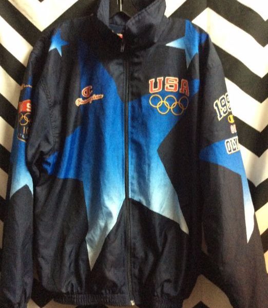 1990’s USA Olympics windbreaker jacket, Champion, zip-up, screen printed, color fade design, color block design, blue/black/red, size L
