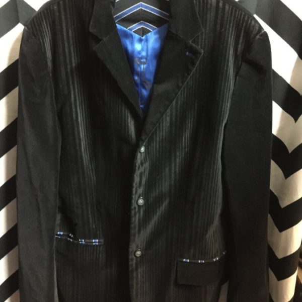 Blazer jacket, button-up, velvet, vertical striped design, satin inner lining, black/blue, size L