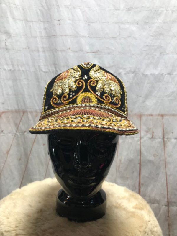 VELVET HAT W/ BURMA INDIA EMBROIDERED HEARTS & ELEPHANTS DESIGN