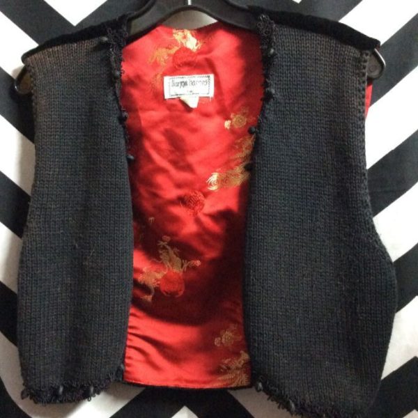 Vest, velvet & knit, appliqued knot design with tassels, satin lining with Chinese design, black/red/gold