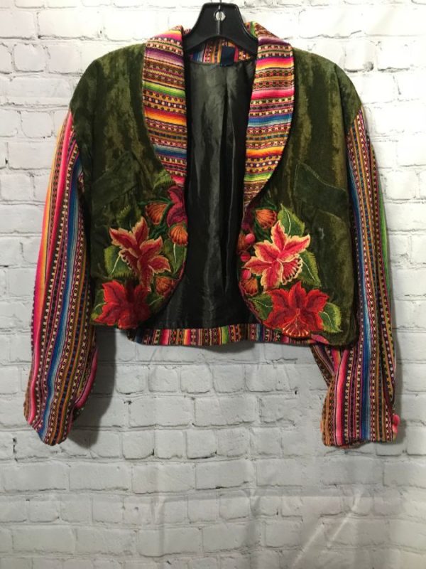 Blazer jacket, cropped, long sleeves, velvet, Ethnic embroidered floral design, color-block design with striped pattern & solid fabric, dark-green/green/red/multi, size S