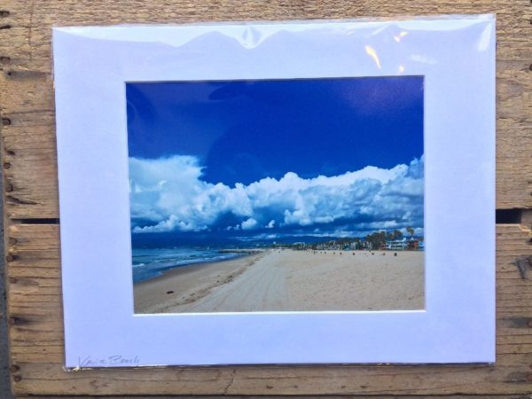 Venice Beach Photos mounted photograph, Venice Beach scene with sand/ocean/blue skies, local photographer Ray Rae, blue/white/tan, size 10″ x 13″