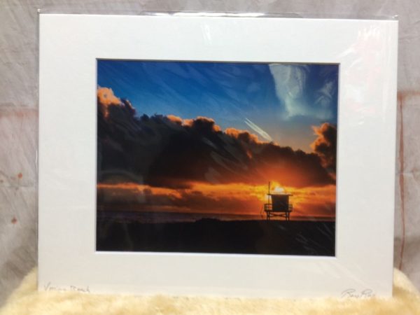 Mounted photograph, Ray Rae local photographer, Venice Ca. at sunset with silhouette of lifeguard stand, size 10″ x 13″