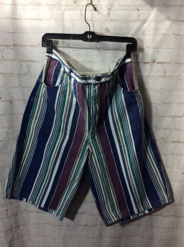 Legacy denim shorts, zip-up, front & back pockets, vertical striped design, purple/blue/teal/white/brown. 33W