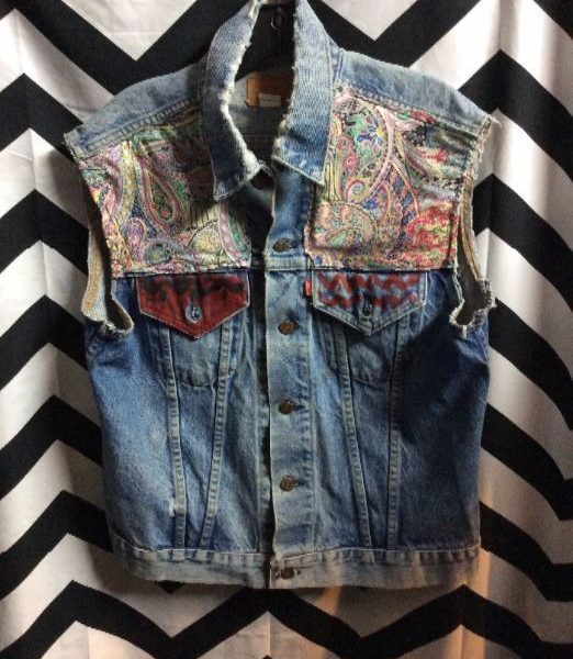 LEVIS DENIM VEST – CUTOFF SLEEVES – PAISLEY PATTERN CHEST & BACK PATCHWORK – PAINTED POCKETS