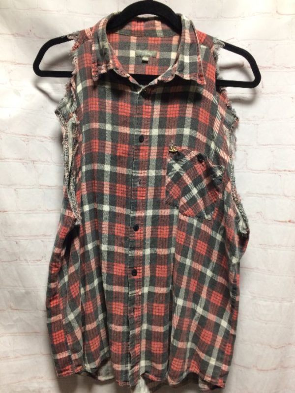 For The Man My Wear vest, flannel, cut-out sleeves, button-up, thin, single front pocket, plaid design, distressed, red/black/white, size 43/44