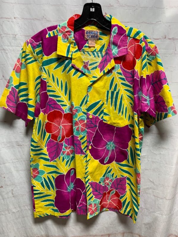 Beach Scene Hawaiian shirt, cotton, short sleeves, button-up, bright vibrant colors, hibiscus floral pattern, yellow/pink/purple/white/teal, size M small fit