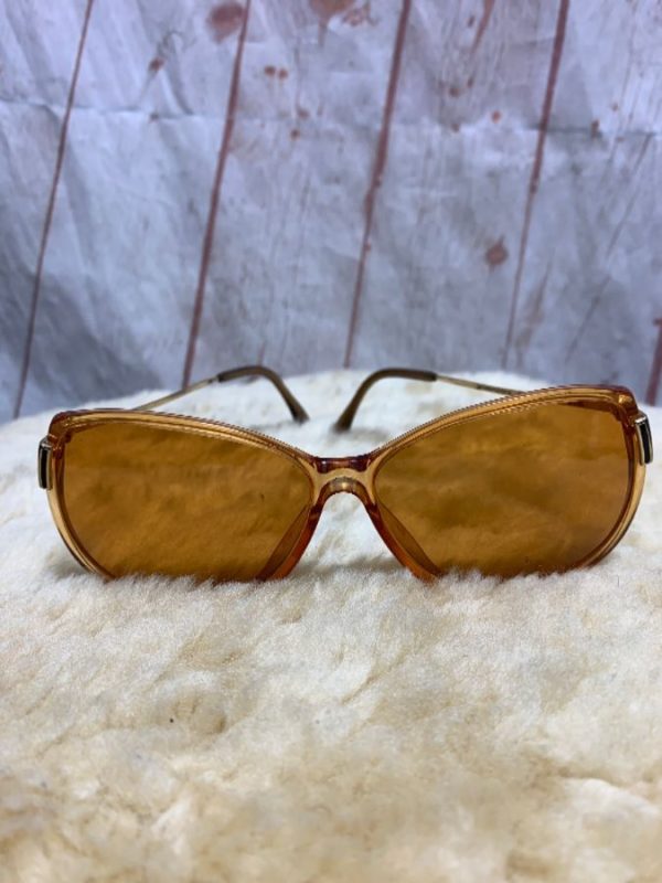 Vintage 1960’s-70’s Rodenstock sunglasses, cat eye style, plastic frames, silver metal side pieces, warm lenses, amber/silver
