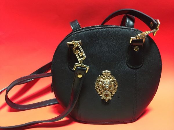 Vintage 1980’s-90’s bag, round, leather, cross-body strap, lion crest front ornament, gold metal hardware, black/gold