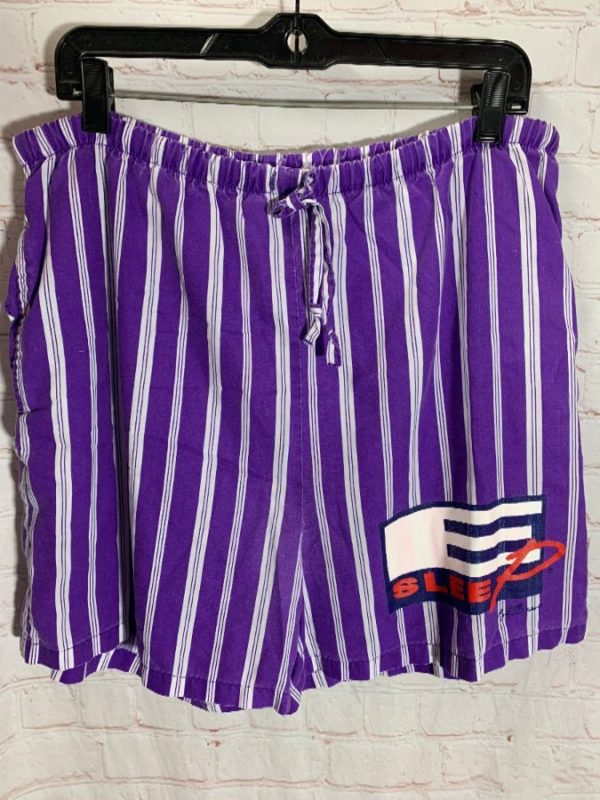 Vintage 1990’s beach shorts, cotton, drawstring waist, vertical striped design, side pockets, lower left leg screen printed E sleeP logo, purple/navy-blue/red/white, size XL