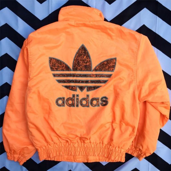 Vintage Adidas jacket, zip-up, fleece lining, silk screen Trefoil logo on back, day-glow orange/black, size M