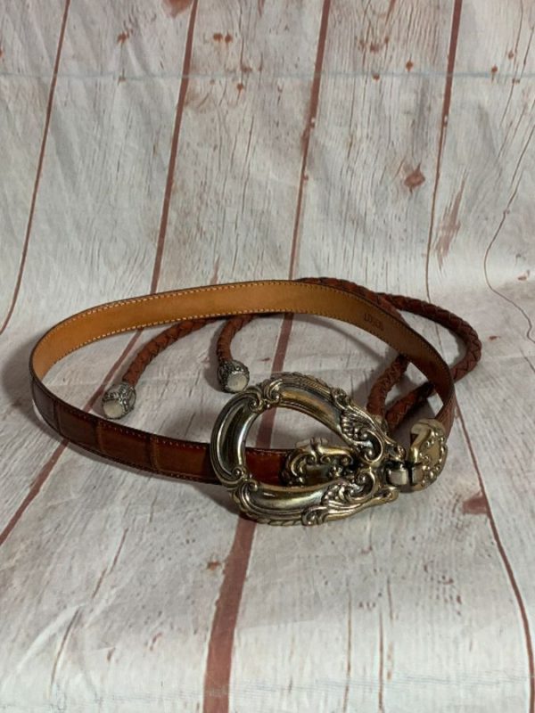 Vintage belt, alligator skin, 2 braided leather tassels with metal end tips, silver metal ornate teardrop shaped buckle and two connected links, brown/silver, size S/M
