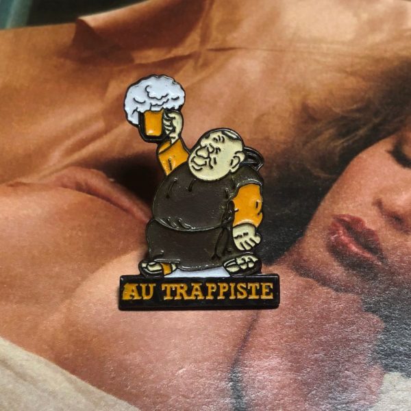 Rare vintage enamel pin, Au Trappiste Friar holding beer, white/chocolate/black/yellow gold