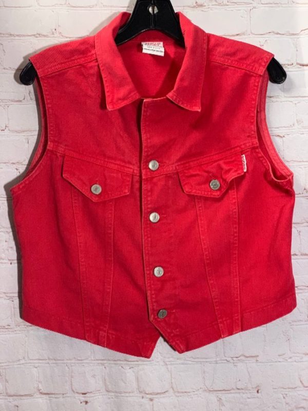 Vintage Bongo, cropped, sleeveless, button-up, collar, button-up front pockets, red/silver, size L