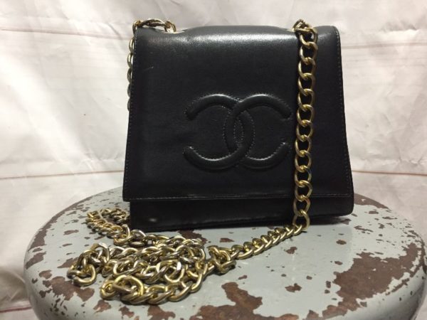 VINTAGE BAG, BOOTLEG CHANEL WITH CC LOGO, LAMBSKIN LEATHER, FLAP WITH SNAP CLOSURE, LONG CROSS-BODY GOLD METAL CHAIN, BLACK/GOLD