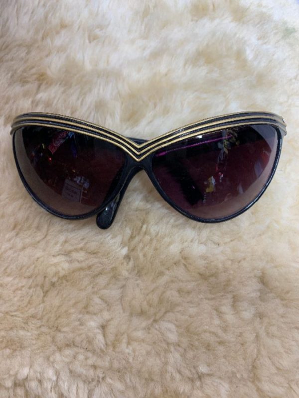 Vintage sunglasses, sexy, bug-eye style, triple line trim on brow piece and rectangle trim on temple pieces, painted gold metal look trim, black/gold As is