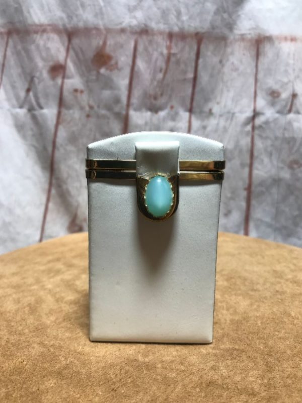 Vintage Bond Street cigarette/card holder, gold metal looking hardware with turquoise gem clasp, leather box case, white/gold/turquoise, size one size