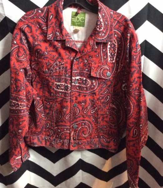 Vintage denim jacket, button-up, bandana print, red/white/black, size S/M