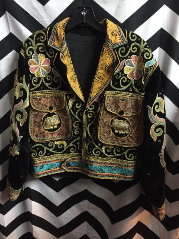 Vintage jacket, button-up, Burmese Kalago tapestry, metallic thread, elephant & dragon designs, 2 front pockets, black/gold/multi, size L