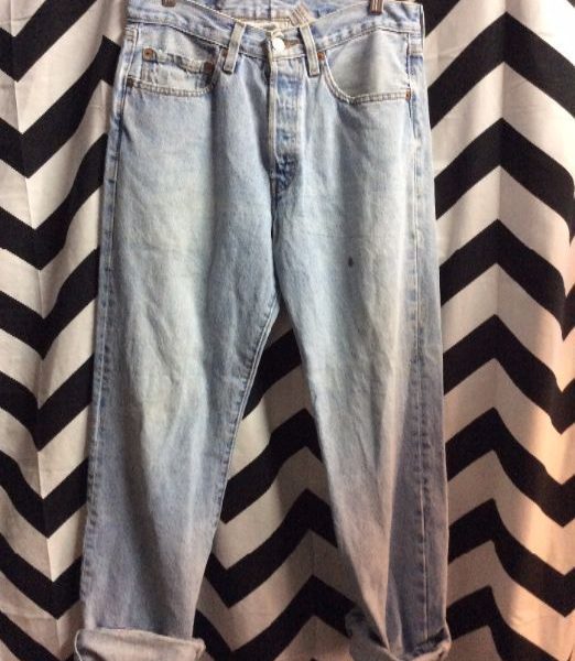 Vintage Levis denim jeans, 501, red tab, distressed, light blue, size 31″ x 32″