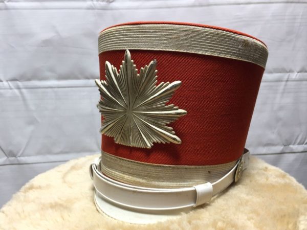 Vintage Ostwald Uniforms hat, marching band style, metal starburst front decoration, front brim and chin strap, rust/silver/white, size one size As is
