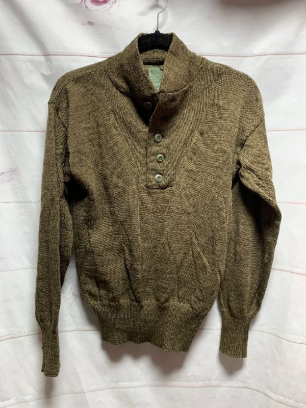 VINTAGE MILITARY ISSUED SWEATER, 100% WOOL, PULLOVER, HALF BUTTON-UP, MOCK COLLAR, OLIVE, SIZE S