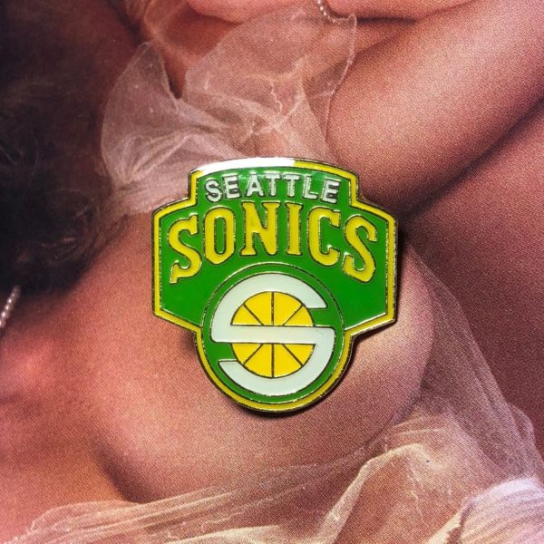Rare vintage enamel pin, Seattle Supersonics, logo with basketball and S, NBA, green/white/yellow/gold